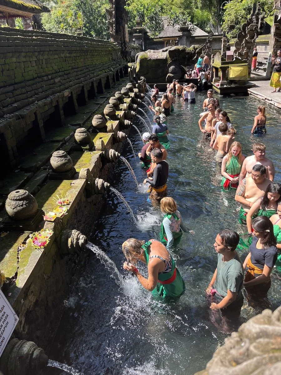 Branden said get to the water temple so I pinged a driver on Gojek who took us out to Tirta Empul, the water temple in the Gianyar Regency, not far from Ubud. It is a sacred site to the Balinese Hindu community, considered one of the five most holy temples in all of Bali. To enter, you must wear a sarong and show respect with a prayer and offering then you’re allowed to pass into the main courtyard where the holy springs are channeled through twenty-two carved stone spouts into purification pools.