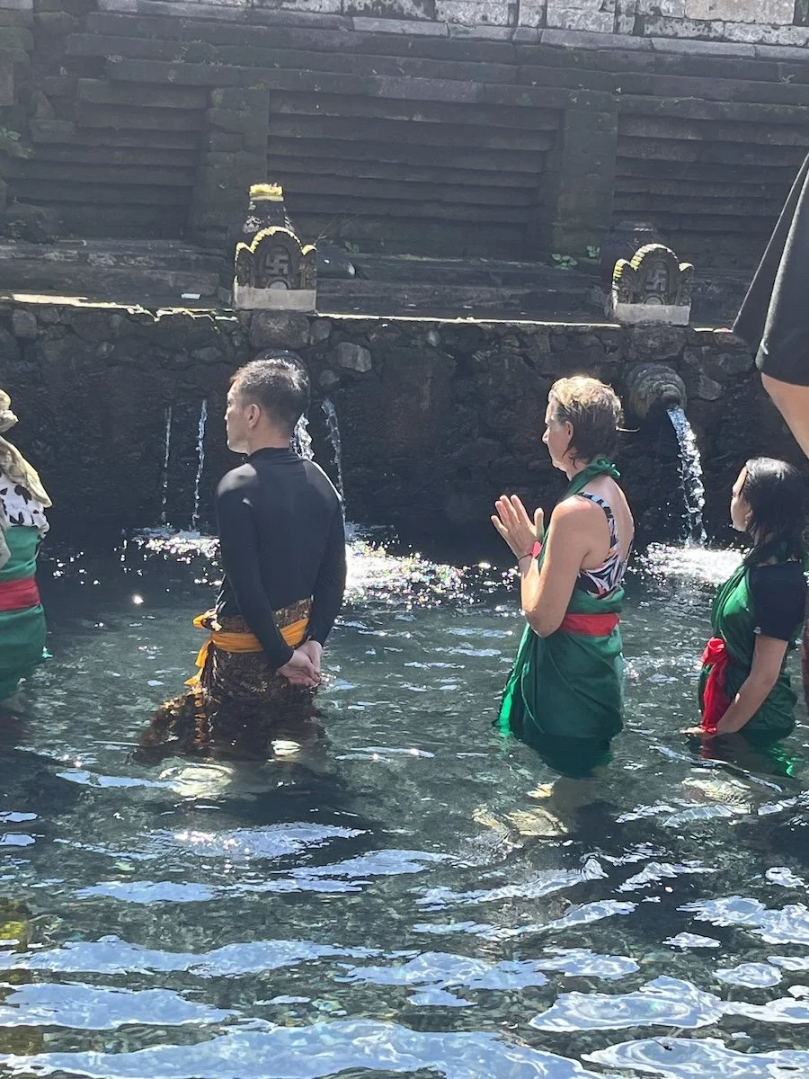Each spout promises a specific protection or cure from eliminating poverty or disease to cleansing you of your sins, ensuring your business is successful. Cecilia and I lined up in the wading pool with the other bathers and waited for our moment to dunk our heads. I warned Cecilia to keep her lips closed and not swallow any water, though the Balinese do cup their hands and drink.